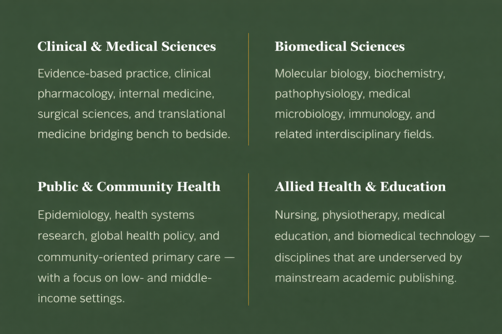 Our publishing focuses on the breadth of the health sciences, with particular emphasis on clinical medicine, biomedical research, public and community health, and allied health disciplines.